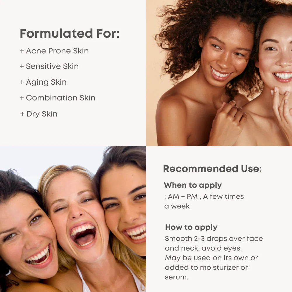 Suitable for all skin types, especially those with pigmentation, breakouts or sensitivity. Use regularly for clearer, more even-looking skin.